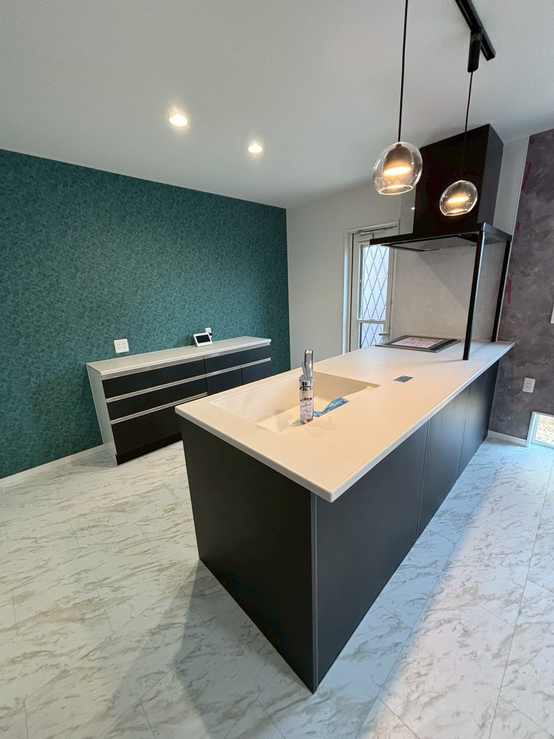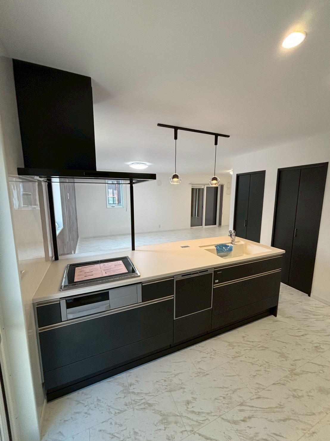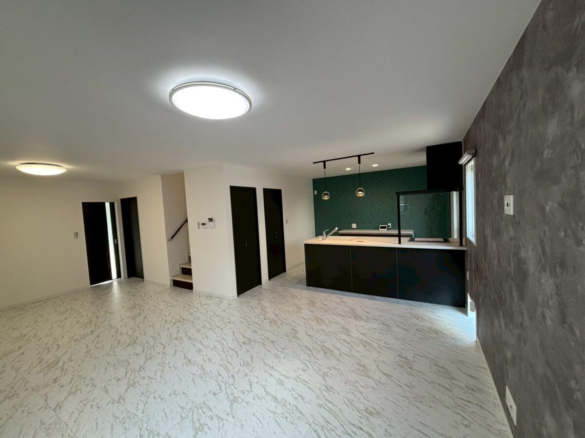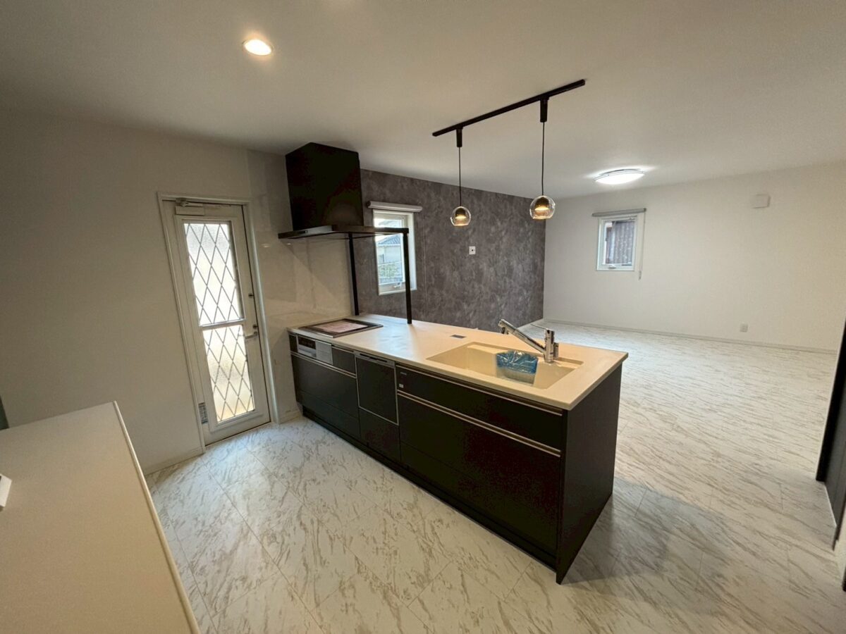 ダークカラーでまとめたキッチンが空間全体を引き締め、スタイリッシュな印象を演出しました。