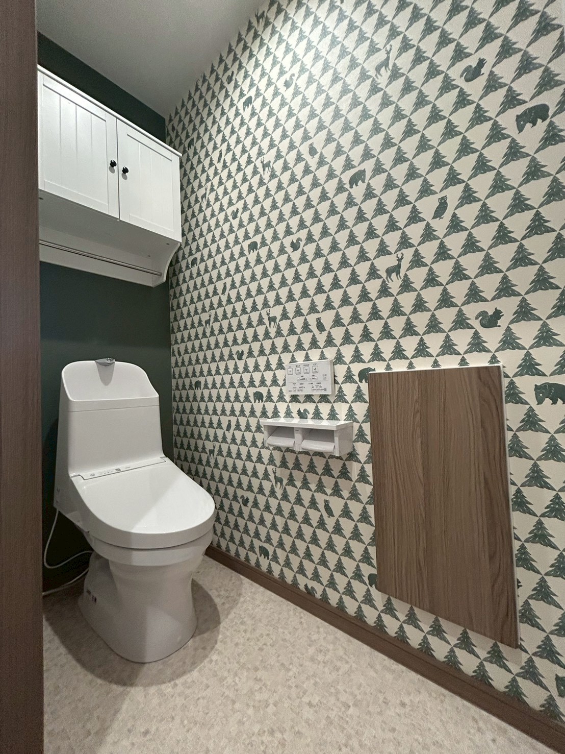 外観は落ち着いたダークグリーンをベースに、玄関まわりにアイボリーのアクセントを取り入れた、シンプルで上品なデザイン。派手すぎず、長く住んでも飽きのこない外観に仕上がっています。