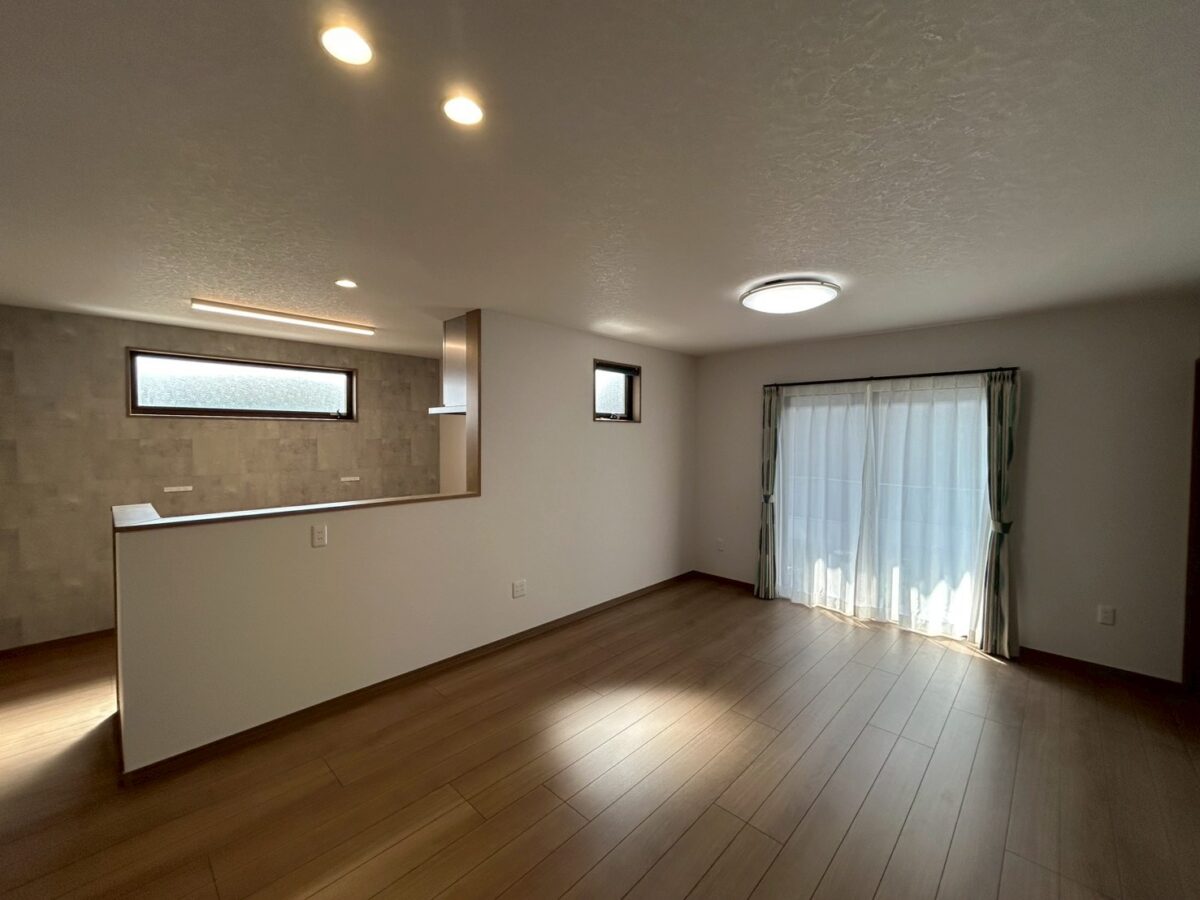LDKは17帖のちょうどいい広さ。キッチンからリビング全体を見渡せる配置になっているので、家族と会話を楽しみながら料理ができます。アクセントクロスや横長の窓を取り入れることで、シンプルながらもおしゃれで落ち着いた空間に仕上がりました。