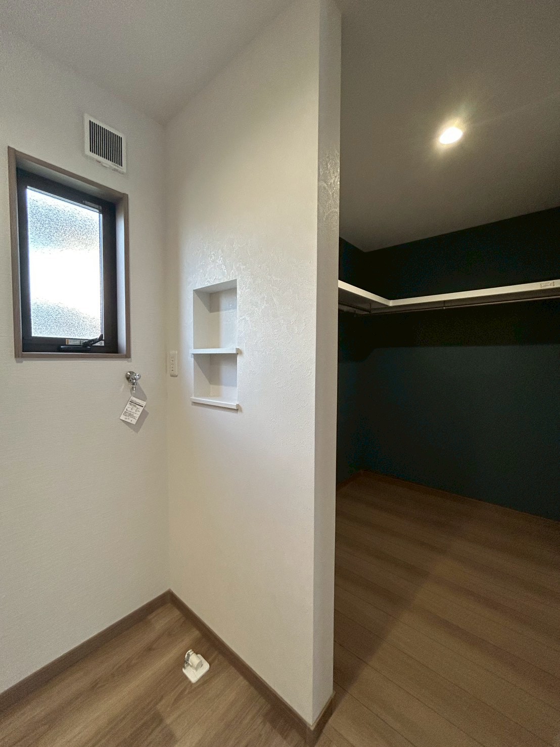 玄関ホールから右手に進むと、ウォークインクローゼットとランドリースペースをまとめた家事ラク動線になっています。洗濯をして、干して、乾いたらすぐに収納できるので、移動の手間が少なく、家事時間の短縮にもつながります。