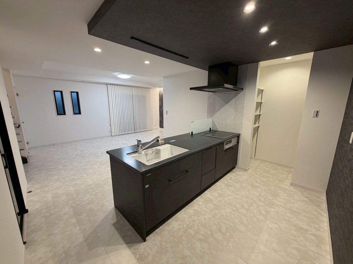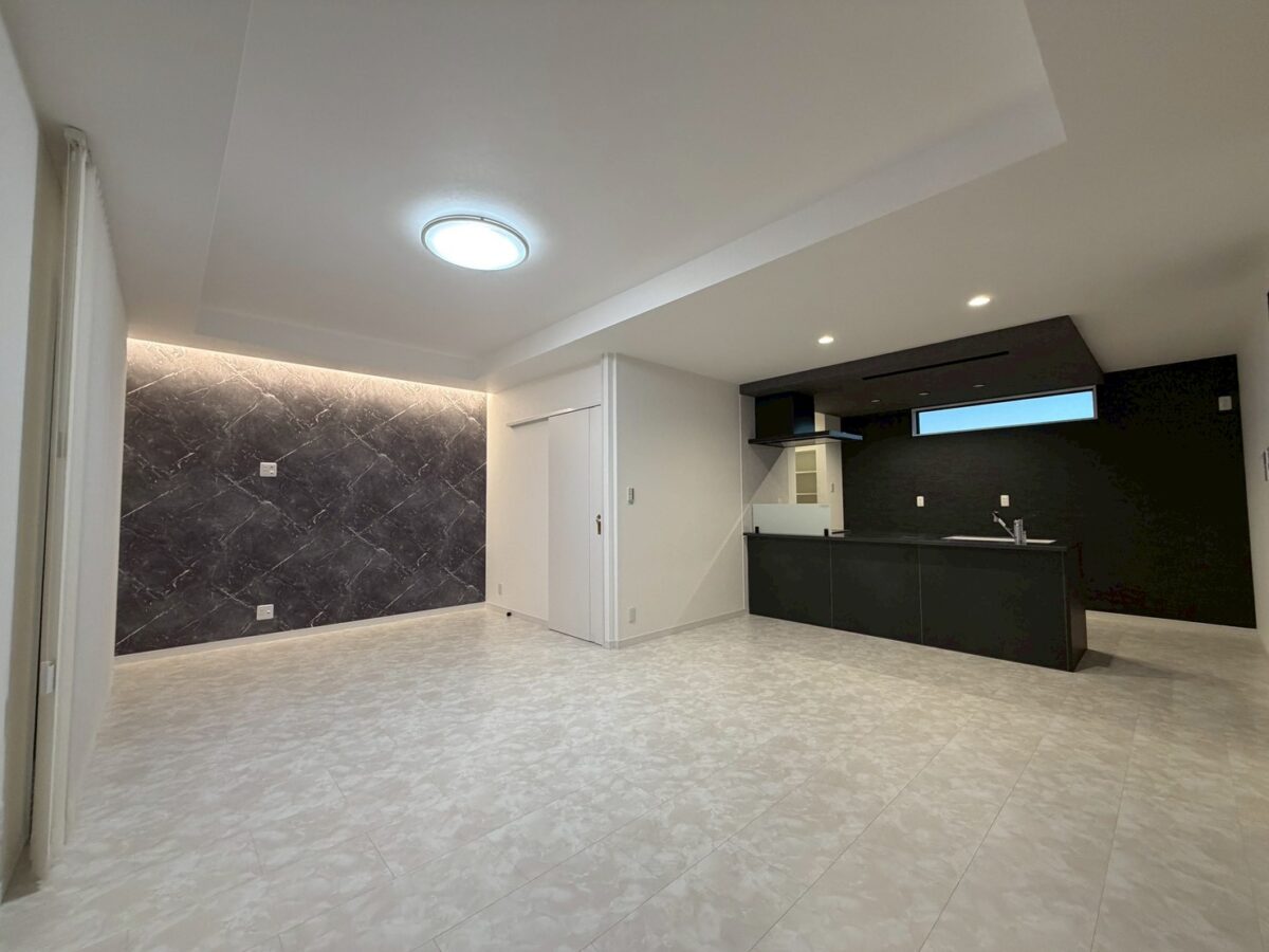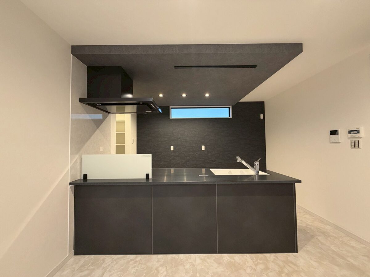 折下げ天井にブラックのアクセントクロスを使い、キッチン設備もブラックで統一。