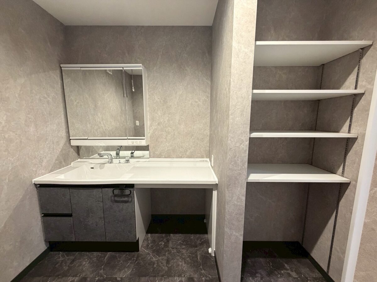 毎日使う洗面室には、4段の可動棚収納を設置。