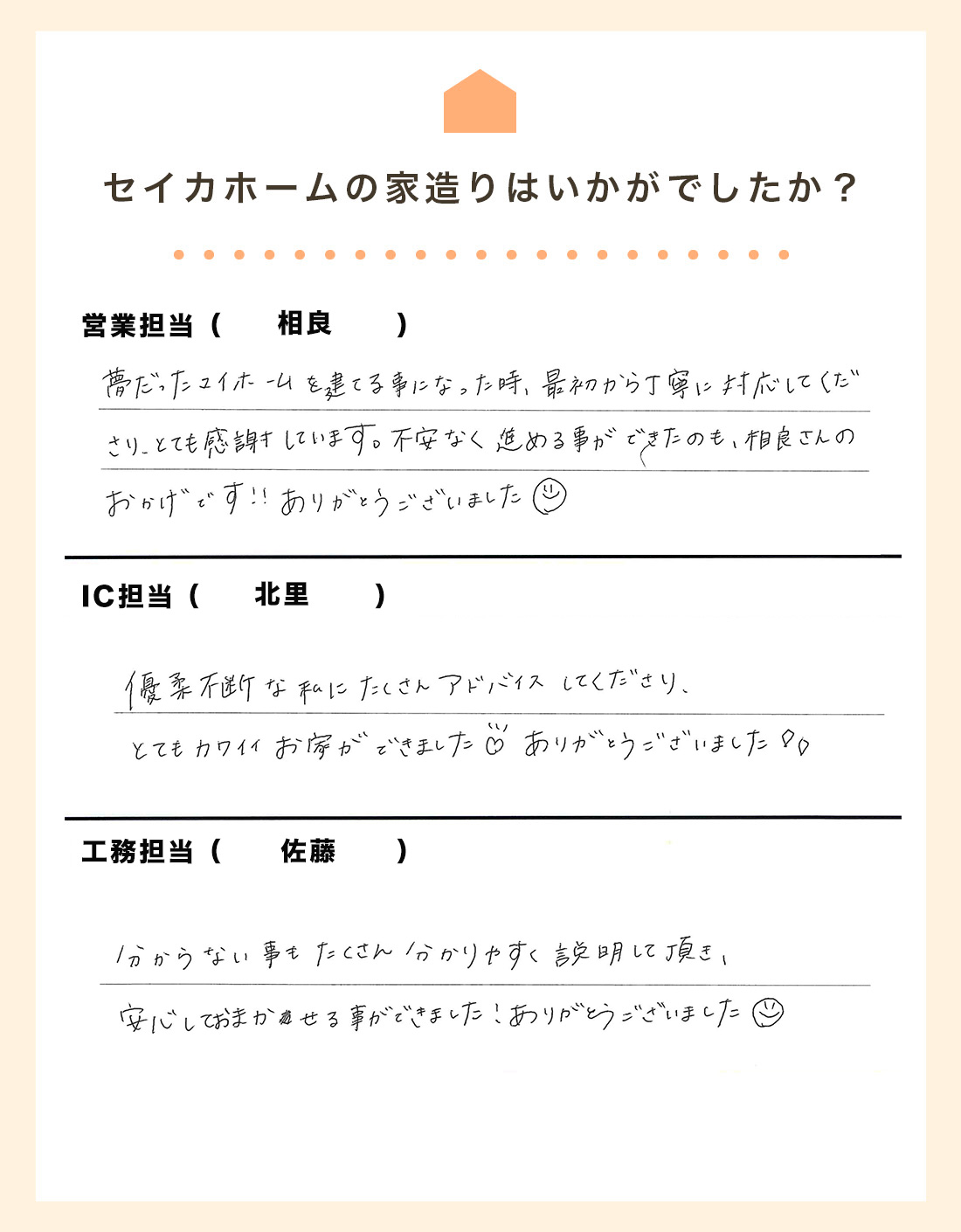 株式会社セイカホームは熊本のローコスト注文住宅ハウスメーカーです。超ローコスト968万円注文住宅「ハピネスエイチ」を始め、低価格で住宅性能に優れた新築注文住宅を提供しています。ローコスト平屋「ハピネスエイチ」、人気の「スマイル」、低価格&使いやすい間取りが嬉しい「ままはぴ」、平屋の注文住宅「縁-EN-」なども好評です。セイカホームは人々が日々を暮らす「家」と「快適な住まいづくり」を通じて、熊本と福岡の皆様の普段の生活をもっと豊かにする地域の工務店でありたいと考えています。また、セイカホームの特徴は「住宅ローンに強い」こと。住宅ローン各種(フラット35・フラット40・おまとめローンなど)・住宅ローン相談随時実施中です!
