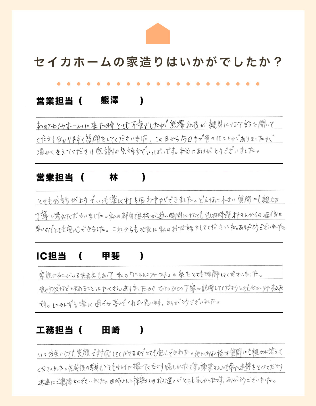 株式会社セイカホームは熊本のローコスト注文住宅ハウスメーカーです。超ローコスト968万円注文住宅「ハピネスエイチ」を始め、低価格で住宅性能に優れた新築注文住宅を提供しています。ローコスト平屋「ハピネスエイチ」、人気の「スマイル」、低価格&使いやすい間取りが嬉しい「ままはぴ」、平屋の注文住宅「縁-EN-」なども好評です。セイカホームは人々が日々を暮らす「家」と「快適な住まいづくり」を通じて、熊本と福岡の皆様の普段の生活をもっと豊かにする地域の工務店でありたいと考えています。また、セイカホームの特徴は「住宅ローンに強い」こと。住宅ローン各種(フラット35・フラット40・おまとめローンなど)・住宅ローン相談随時実施中です!