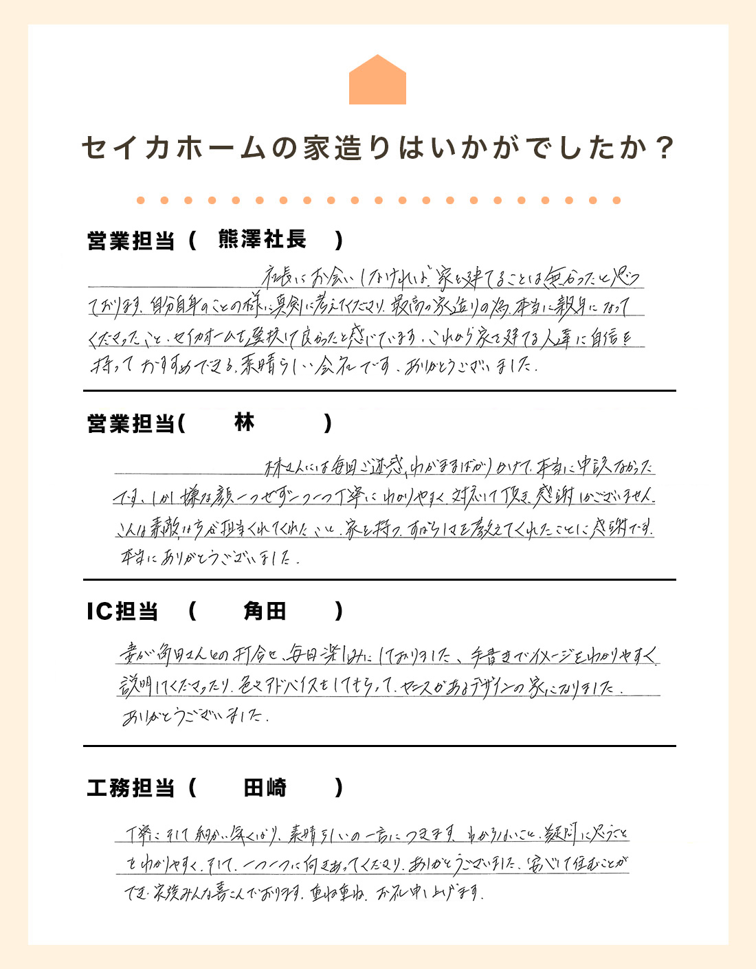 株式会社セイカホームは熊本のローコスト注文住宅ハウスメーカーです。超ローコスト968万円注文住宅「ハピネスエイチ」を始め、低価格で住宅性能に優れた新築注文住宅を提供しています。ローコスト平屋「ハピネスエイチ」、人気の「スマイル」、低価格&使いやすい間取りが嬉しい「ままはぴ」、平屋の注文住宅「縁-EN-」なども好評です。セイカホームは人々が日々を暮らす「家」と「快適な住まいづくり」を通じて、熊本と福岡の皆様の普段の生活をもっと豊かにする地域の工務店でありたいと考えています。また、セイカホームの特徴は「住宅ローンに強い」こと。住宅ローン各種(フラット35・フラット40・おまとめローンなど)・住宅ローン相談随時実施中です!