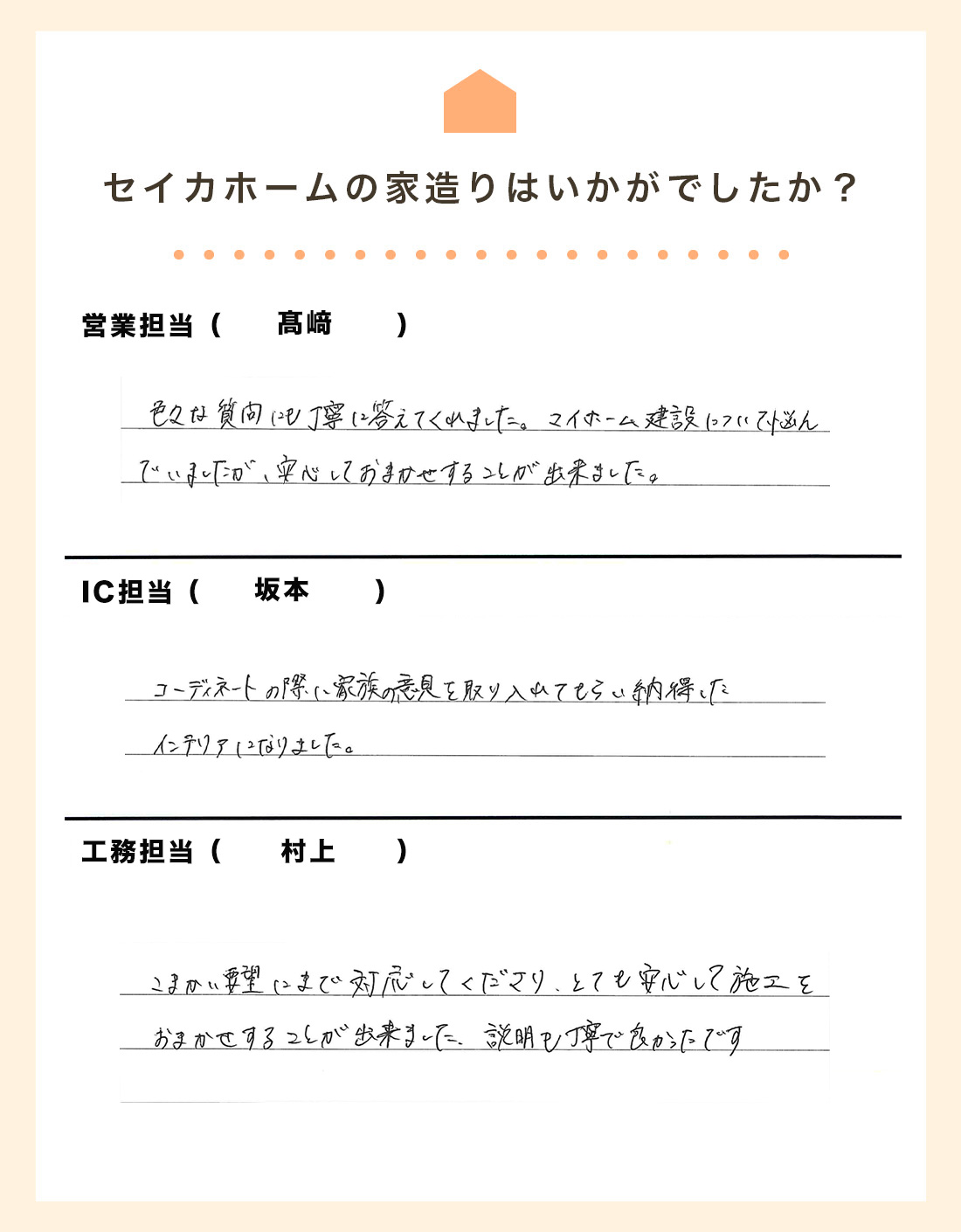 株式会社セイカホームは熊本のローコスト注文住宅ハウスメーカーです。超ローコスト968万円注文住宅「ハピネスエイチ」を始め、低価格で住宅性能に優れた新築注文住宅を提供しています。ローコスト平屋「ハピネスエイチ」、人気の「スマイル」、低価格&使いやすい間取りが嬉しい「ままはぴ」、平屋の注文住宅「縁-EN-」なども好評です。セイカホームは人々が日々を暮らす「家」と「快適な住まいづくり」を通じて、熊本と福岡の皆様の普段の生活をもっと豊かにする地域の工務店でありたいと考えています。また、セイカホームの特徴は「住宅ローンに強い」こと。住宅ローン各種(フラット35・フラット40・おまとめローンなど)・住宅ローン相談随時実施中です!