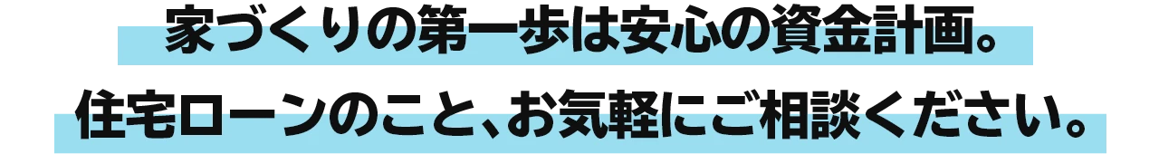 住宅ローンを無理無く返済できるプランを設定し、マイホームの新築後も安心して暮らしていただくこと。それがただ家を建てるだけに留まらない、信頼ある本来のハウスメーカーの使命だと私たちは考えています。フラット35・フラット40・変動金利・おまとめローンなど住宅ローン・資金計画のご相談を随時行っております。お気軽にお電話またはメールにてお問い合わせください!